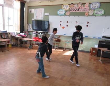 教室の中で,しっぽ取りをしています。友だちのしっぽを取るために,頑張って追いかけています。またみんなで取り組みたいですね。