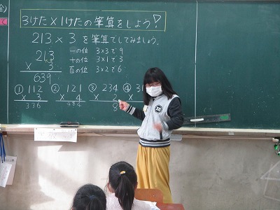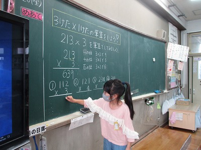 筆算の学習が進んでいます。「2けた×1けた」から「3けた×1けた」に進みました。「2けた×1けた」の計算の仕方を使って計算することができることが分かりました。