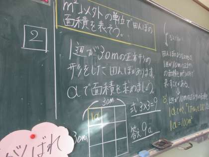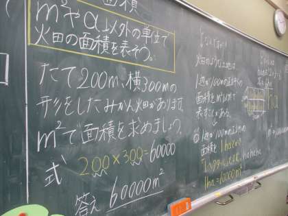 算数科「面積」の単元もクライマックスです。「a」と「ha」はそれぞれ何平方メートルでしょう?