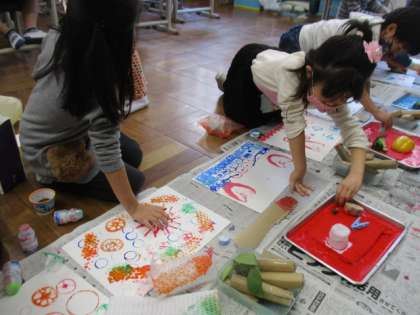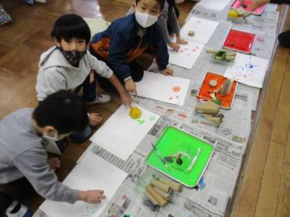 ゼリーのカップ,段ボール,野菜の切り口など,たくさんのもので形をうつしました。