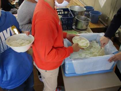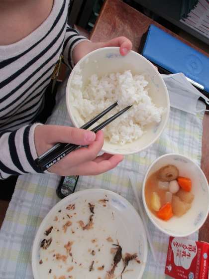 3年生の教室に行くと,学習したことを生かして目を閉じたり,耳をおさえたりして一口ずつじっくりと味わっていました。「もちもちしていておいしい」「白くてツヤツヤ」「甘い匂いがする!」とさまざまな感想を聞くことができました。他の学年でも,「もちもちしている!」と京北米のおいしさををみつけて食べていました。