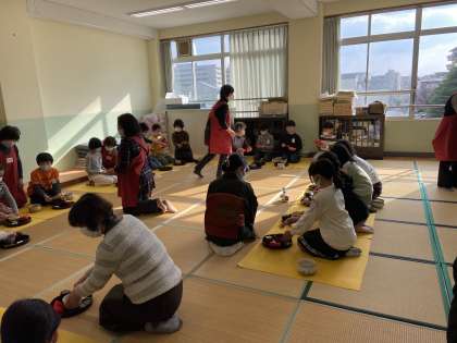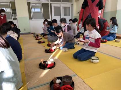 茶道体験をしました。『抹茶飲めるかな?』と心配の声がたくさん聞こえていましたが,終わるころには,『おいしかった!』『楽しかった!』という声がたくさん聞こえてきました。みんな足がしびれながらも作法を教わっていました♪