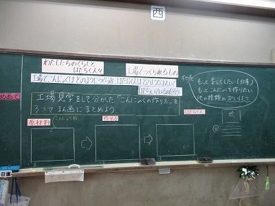 工場見学に行って「見てきたこと」「聞いてきたこと」をまとめました。まとめたことの中から,蒟蒻の作り方を「3コマ漫画」にまとめました。「工場でつくられるもの」の学習時は,みなとっても張り切っています!!