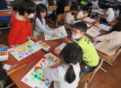 うつした形を動物やお花,食べ物などに見立て,テーマを決めてたのしい絵を描くことができたね!