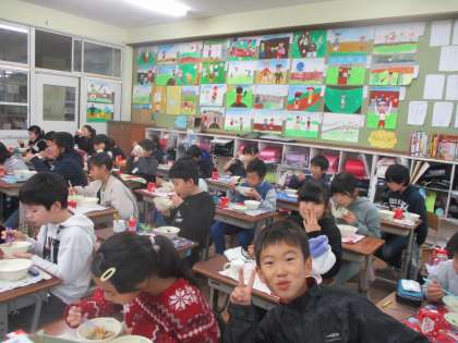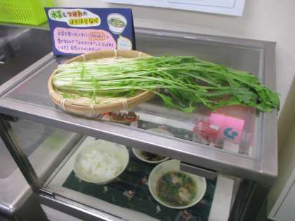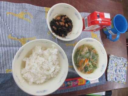 今日の給食に「ハリハリ鍋」がでました。水菜の食感をたのしみながら食べました。