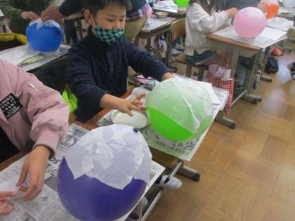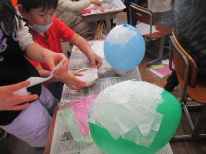やっと風船を膨らませられたら,のりを使って和紙を張り付けていきます。