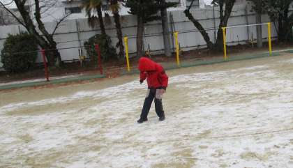 今日は朝から雪が降って,運動場にも少しだけ積もっていました。