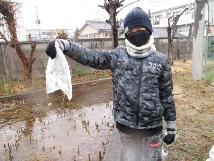 かき集めて触ってみたり,凍っている地面をすべってみたりしていました。