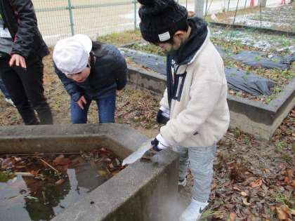 池には分厚い氷が張っていて,持ち上げたり割ったりして遊びました。