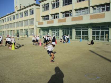 体育の「とびあそび」で遠くまでとぶことや高くとぶことに挑戦しています!