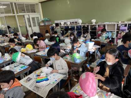 丸い和紙で作った風船に,色を塗りました。いろいろな形に切り,自分のアイデア通りに色を塗りました!完成が楽しみです!