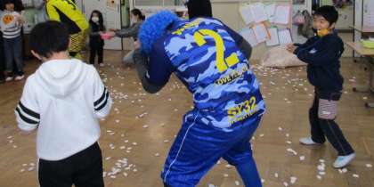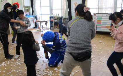 「こわい〜」と固まってしまったお友達もいましたが,「おには〜そと!」と豆をまきました。