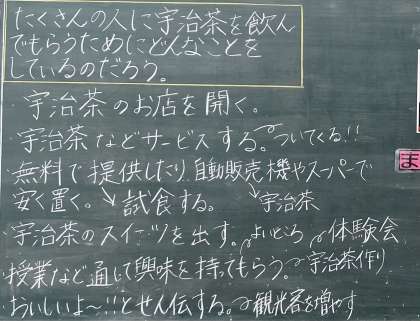 『たくさんの人に宇治茶を飲んでもらうためにどんなことをしているのだろう』という学習で,自分だったらどうするか考えました。「宇治茶を作って売っている社長になりきる!」と言いながらたくさんの工夫が出てとても楽しい学習の時間でした。大人では思いつかないようなこともたくさん思いつく姿を見て,未来が楽しみになりました♪