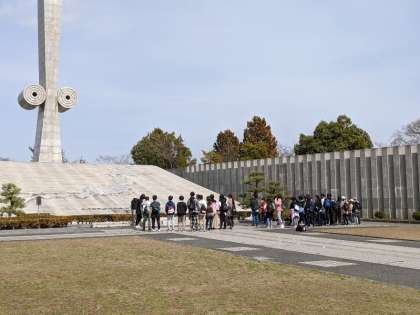 『太平洋戦全国戦災都市空爆死没者慰霊塔』※の見学をしています。