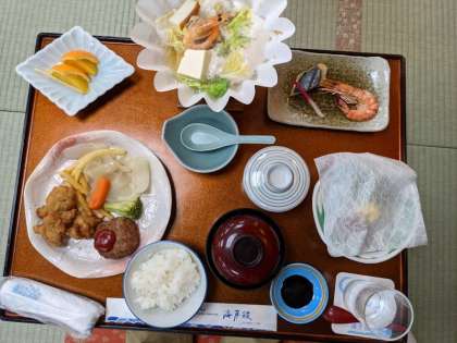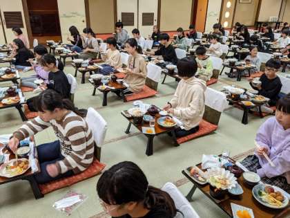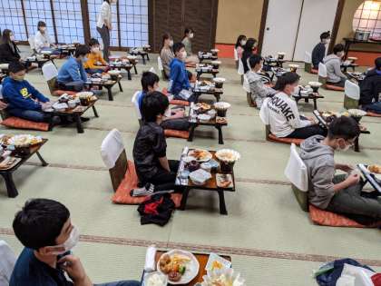 夕食の時間です。楽しくお話しながら・・・と言いたいところですが,ここでも默食です。こんなときだからこそ「黙食」,しっかり守ります。
