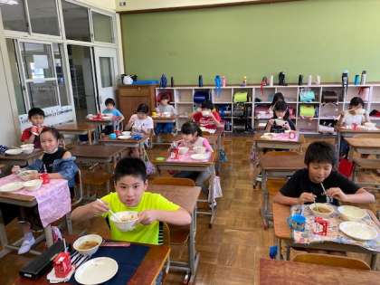 今では,教室びっしりでも,静かに食べることができています。