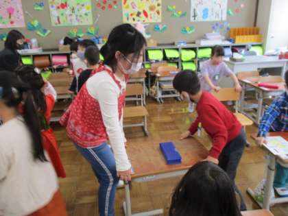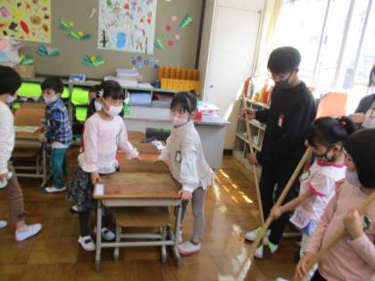 今日も,6年生に掃除を教えてもらいました!ほうきの使い方や,机運びの仕方,黒板消しの仕方を習いました!ぴかぴかです(^▽^)/