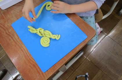 図画工作科で「ひもひもねんど」の学習をしました。のばした粘土で何ができるかな?ぐるぐる巻いたり,編んでみたり……。どこまでのばせるか挑戦している人もいました!!
