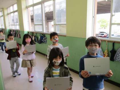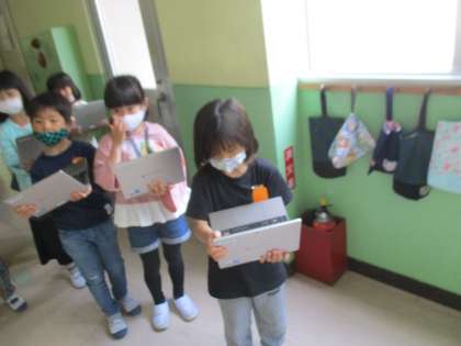 タブレットを落とさないように気を付けながら,友だちを見つけに,学校探検です!!