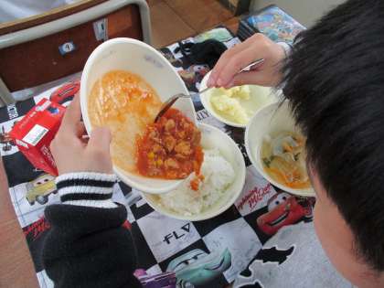 チキンライスの具は教室で各自でごはんに混ぜて食べます。甘酸っぱいケチャップ味がとても人気でした。スープも野菜がたっぷり入っていましたが,「おいしい〜」とよく食べていました。