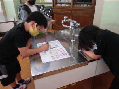 調理実習で使う調理用具を見に家庭科室に行きました。