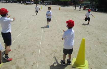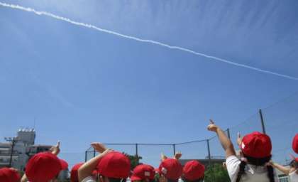 体育は,鉄棒に引き続き,リレー遊びをしています。空を見上げると,ひこうき雲を見つけました!!