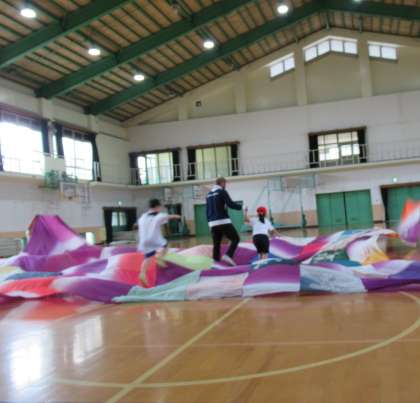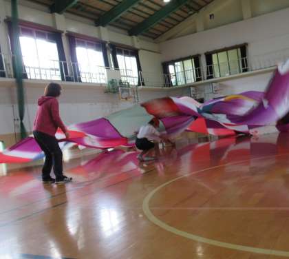 体育の学習で「ふろしきバルーン」をしました。波打つふろしきの上を歩いたり,もぐったりしました。歩くのは少し怖そうな人もいましたが,みんなとても楽しそな姿が見られました。