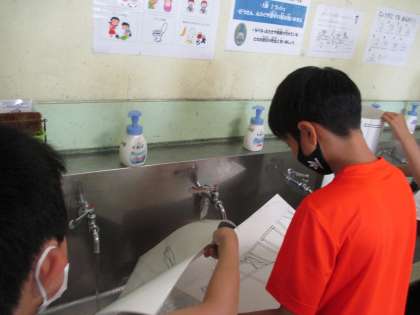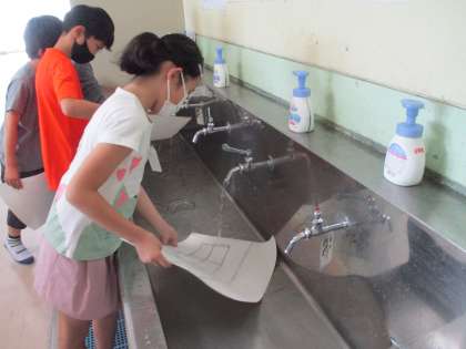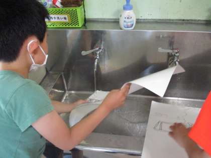 図画工作科のクロッキーもいよいよ色塗りです。画用紙をしっかり濡らしてから色をつけていきます。