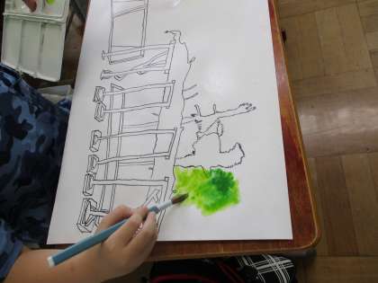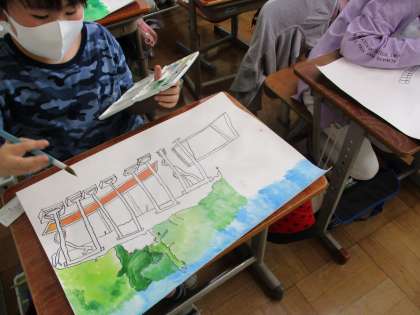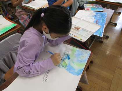 たっぷり濡らした画用紙に筆に色をつけて,とんとんと置くように色をつけていきます。