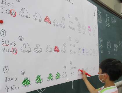 算数の時間に「なんばんめ」の学習が始まりました。「前から3番目」と「前から3人」では,違いがあることを学習していきます。