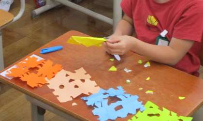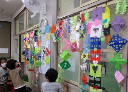 図画工作科の学習で「ちょきちょきかざり」をしました。紙を折ったり,重ねたりしてから,はさみで切ってみると,不思議な形やきれいな形の飾りができました。素敵な飾りで教室が明るくなりました!!
