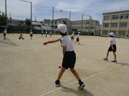 体育の学習は,遠投と鉄棒をしています。
