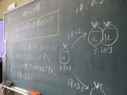 算数科では「小数のかけ算」を式を確認しあったり,教えあったりみんなで力を合わせて頑張っています。