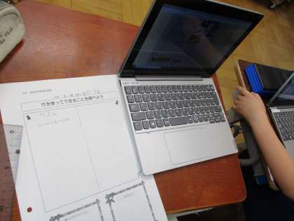 総合的な学習の時間では,竹に関する学習を進めています。今日はタブレットを使って竹を使って出来そうなことを調べ,プリントにまとめました。