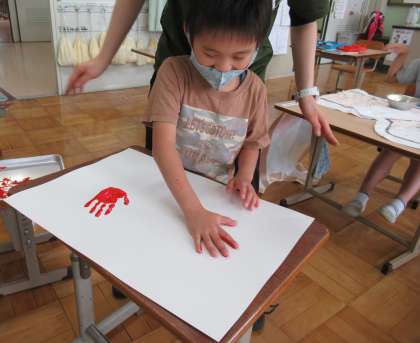 図工の時間に「手」や「足」を使って,手形や足形のスタンプを押しました。