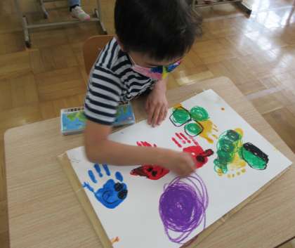 自分が押した「手」や「足」にクレヨンで模様を描きました。