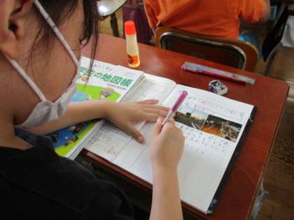 京都市のまちの様子を調べてノートに書きました。お寺や神社が集まっているところ,工場が多いところ,山が多いところなど,それぞれに様子が違うことがわかりました。