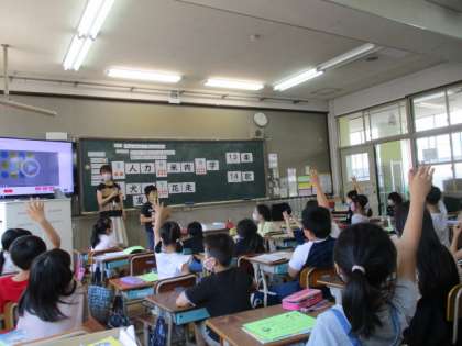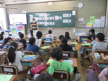 外国語の学習では,数をたずねたりこたえたりする学習をしています。今日は,この漢字の画数はいくつかな?問題を出し合い,友だちとの交流を楽しみました。