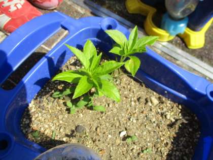 理科の学習で植えた野菜や花の種が発芽して,少しずつ大きくなってきました。これからどんなふうに成長していくのでしょうか。太陽の光をいっぱい浴びて大きく育つといいですね。
