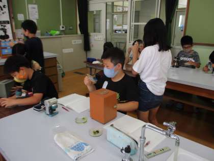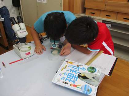 理科では顕微鏡を使って,メダカの観察をしています。卵をよく見てみると,目が見えたり,メダカの体をよく見てみるとお腹のところに何かがあったり・・・色々な発見がありました。