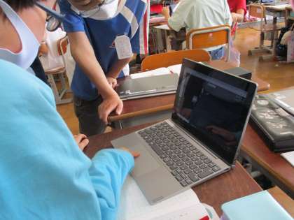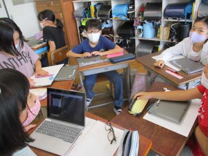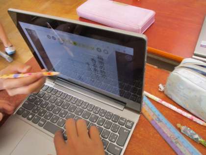先生が考えた「雨の中 ゆれるあじさい きれいだな」という俳句を班でより良い俳句になるように考えました。