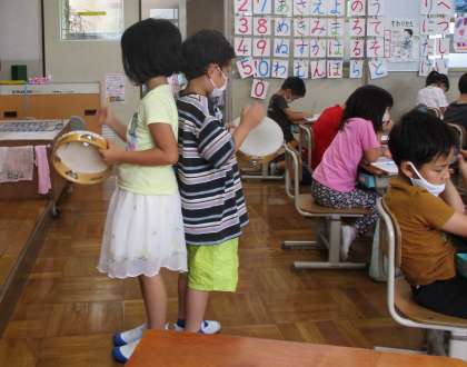 音楽の時間に「白くまのジェンカ」という曲に合わせてリズム打ちをするテストをしました。友だちと背中合わせになってのテストです。みんな,ちょっと緊張していたようです。