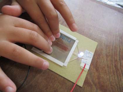様々な作業工程を経て,ついにLEDランプが点灯しました! きれい…!