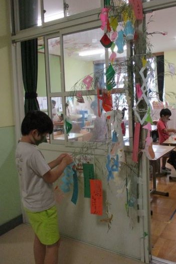 笹には,折り紙で作った笹飾りと願い事を書いた短冊を飾りました。