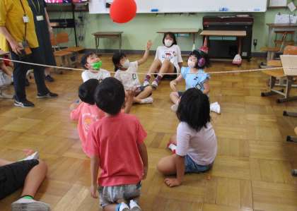 お尻をつけたまま移動したり風船を打ったりするのは大変でしたが,みんなで力を合わせてゲームをして楽しんでいました。