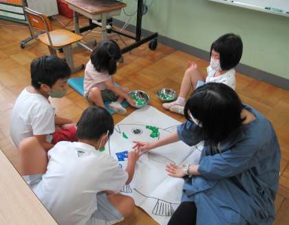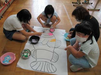 大きな魚の絵に,細かくちぎった折り紙を1枚ずつ丁寧に貼っています。隙間がないように意識しながら取り組んでいます。