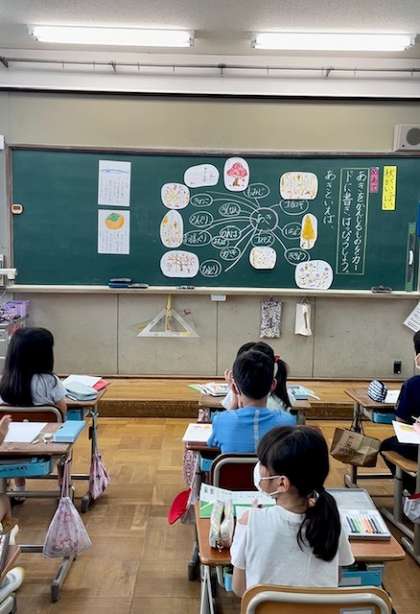 国語の学習で,秋を感じるものをカードに書きました。「どんなものを見たときに,秋だなぁと感じますか」とたずねると,すぐに手が挙がりました。どんぐり,まつぼっくり,いちょう,かき,もみじ・・・などたくさんの秋がでました。