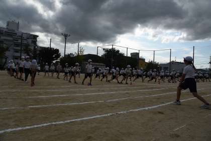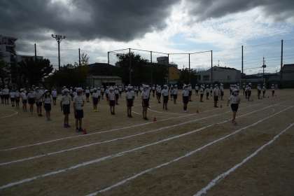 3年生の体育科学習発表会がはじまりました。準備体操では,曲に合わせてしっかり体を曲げたり伸ばしたりしました。