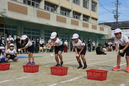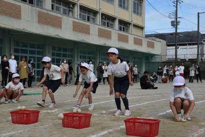 続いて障害物走です。跳んでくぐってボールを投げて,ゴールを目指して最後まで力いっぱい走りました。