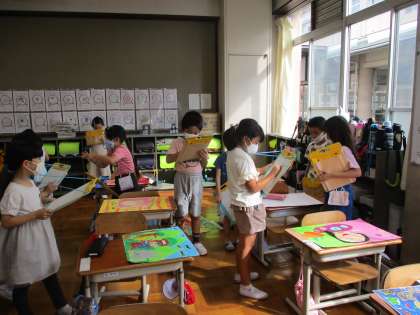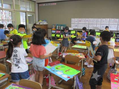 図工の時間に,お話の絵の鑑賞をしました。友だちの良いところを見つけたり,自分の作品の見てほしいところを書いたりしました。